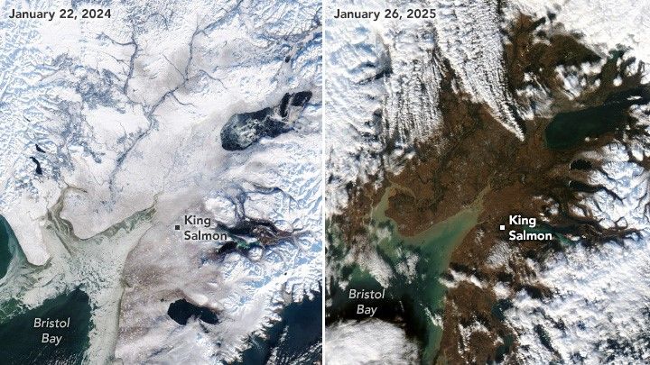 The images, taken by the Moderate Resolution Imaging Spectroradiometer (MODIS) instrument on NASA’s Terra and Aqua satellites, show Bristol Bay Borough in southern Alaska. Anchorage, which is located to the northeast, had an average January snow depth of 13 inches (33 centimeters) between 1998 and 2025.