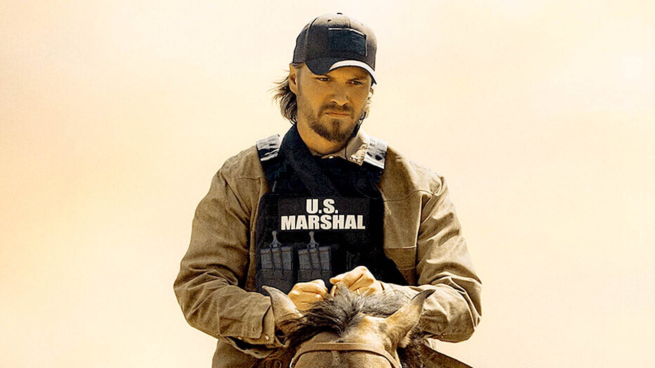 Luke Grimes sits on a horse in Marshals