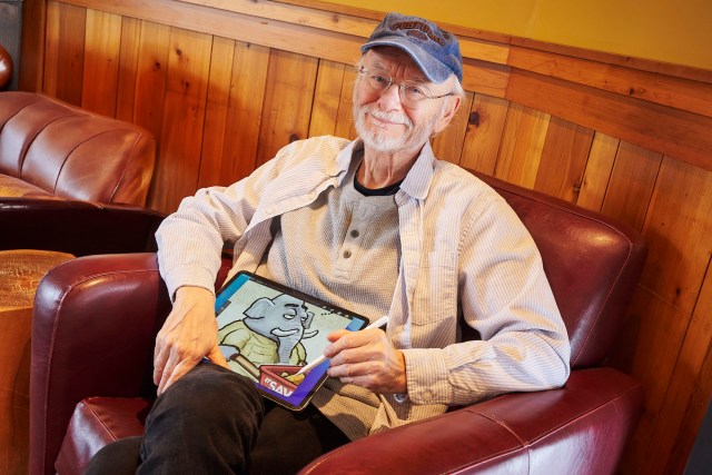 A man in a baseball cap in a leather chair shows a drawing of an elephant on an iPad.