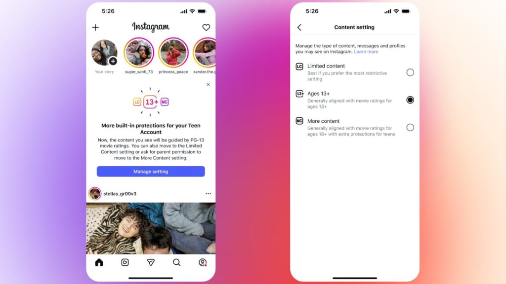 Inspired by the standards established by the Motion Picture Association of America (MPAA), the new settings are Meta’s first major overhaul of Teen Accounts since the feature was launched in 2024. The default safety settings now include age-appropriate content filters similar to the standards of the MPAA, which currently slaps a PG-13 rating on content that may not be suitable for children under 13. Such content may include brief nudity, mild drug use, minor instances of violence, or a single expletive, and “parents are urged to be cautious,” the MPAA warning reads.